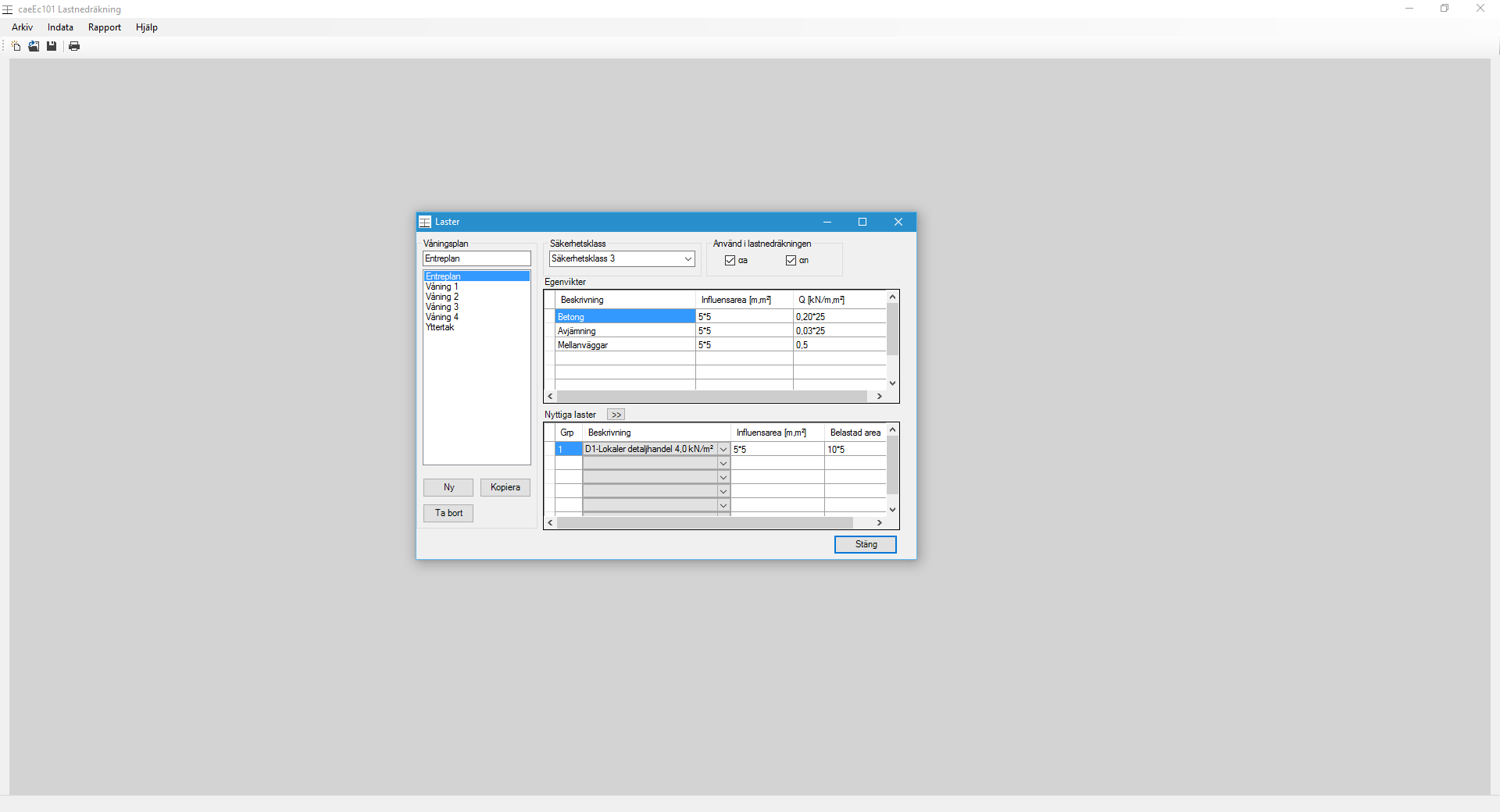 Lastnedräkning av flervåningshus enligt EN 1991-1-1, utdata är kombinerade laster.