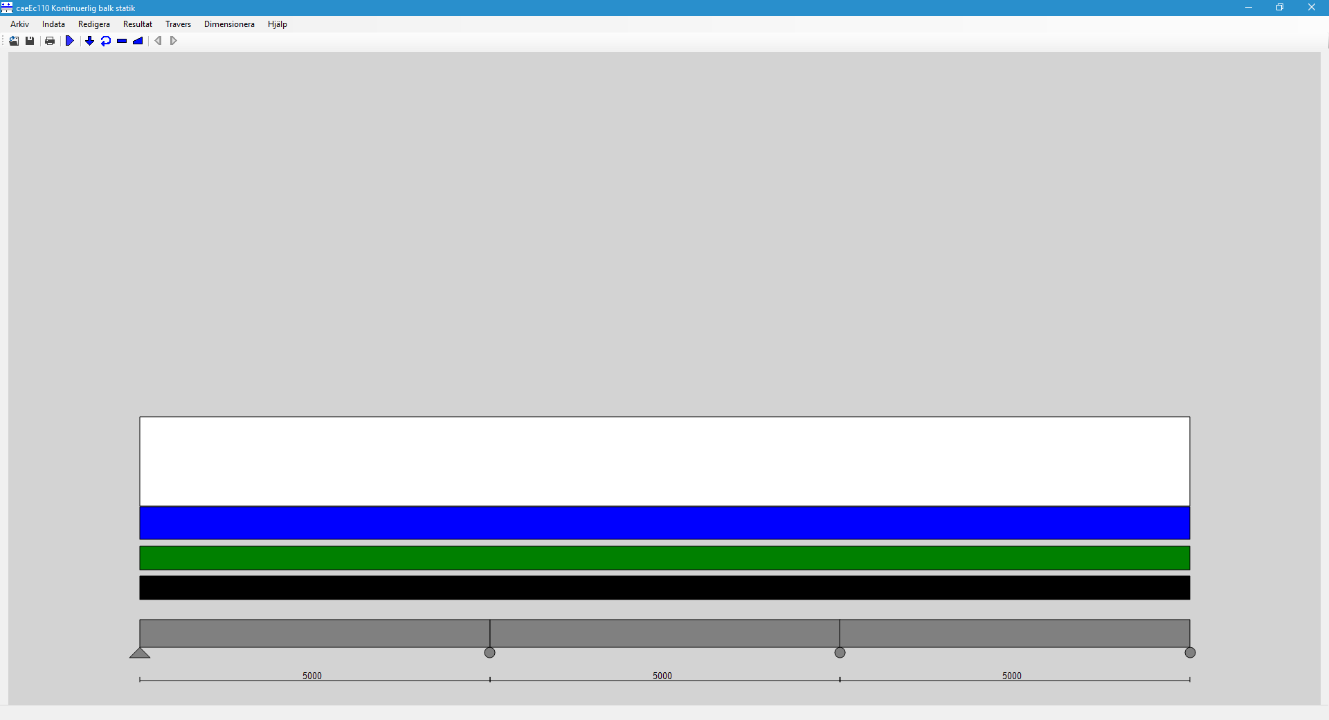 Kontinuerlig balk med lastgenerering enligt EN 1991-1, utdata är upplagsreaktioner, snittkrafter och deformationer.