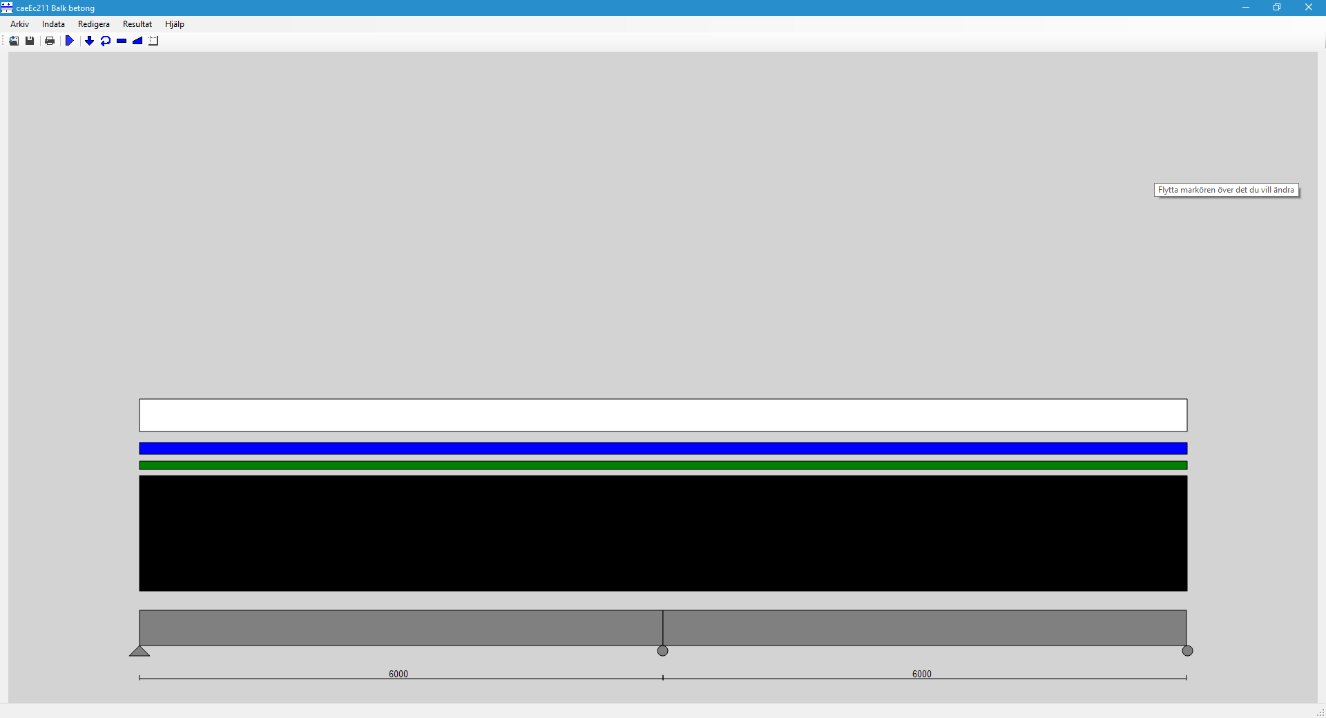 Dimensionering av betongbalk i brott- och bruksgränstillstånd, utdata är snittkrafter, armeringsmängd och grafisk redovisning av inlagd av armering.