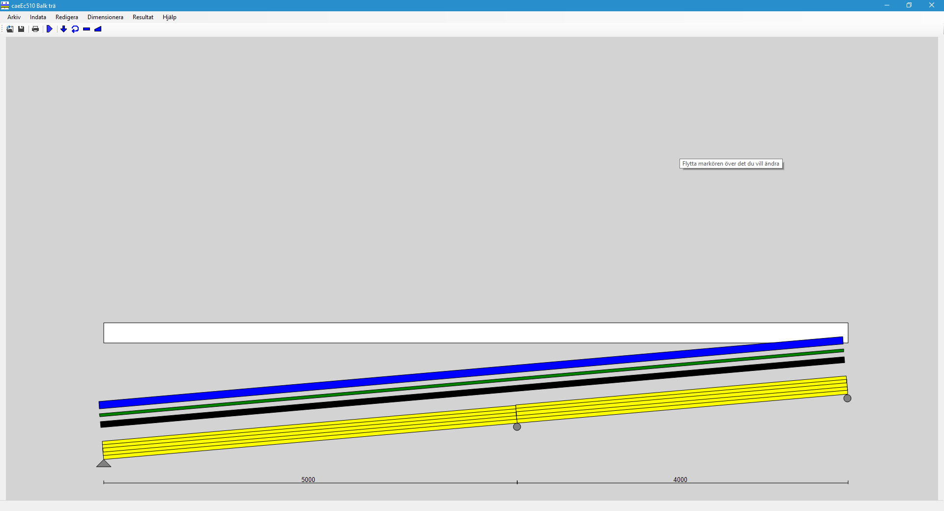 Dimensionering av balkar i trä, utdata är snittkrafter, nedböjning och utnyttjandegrad.